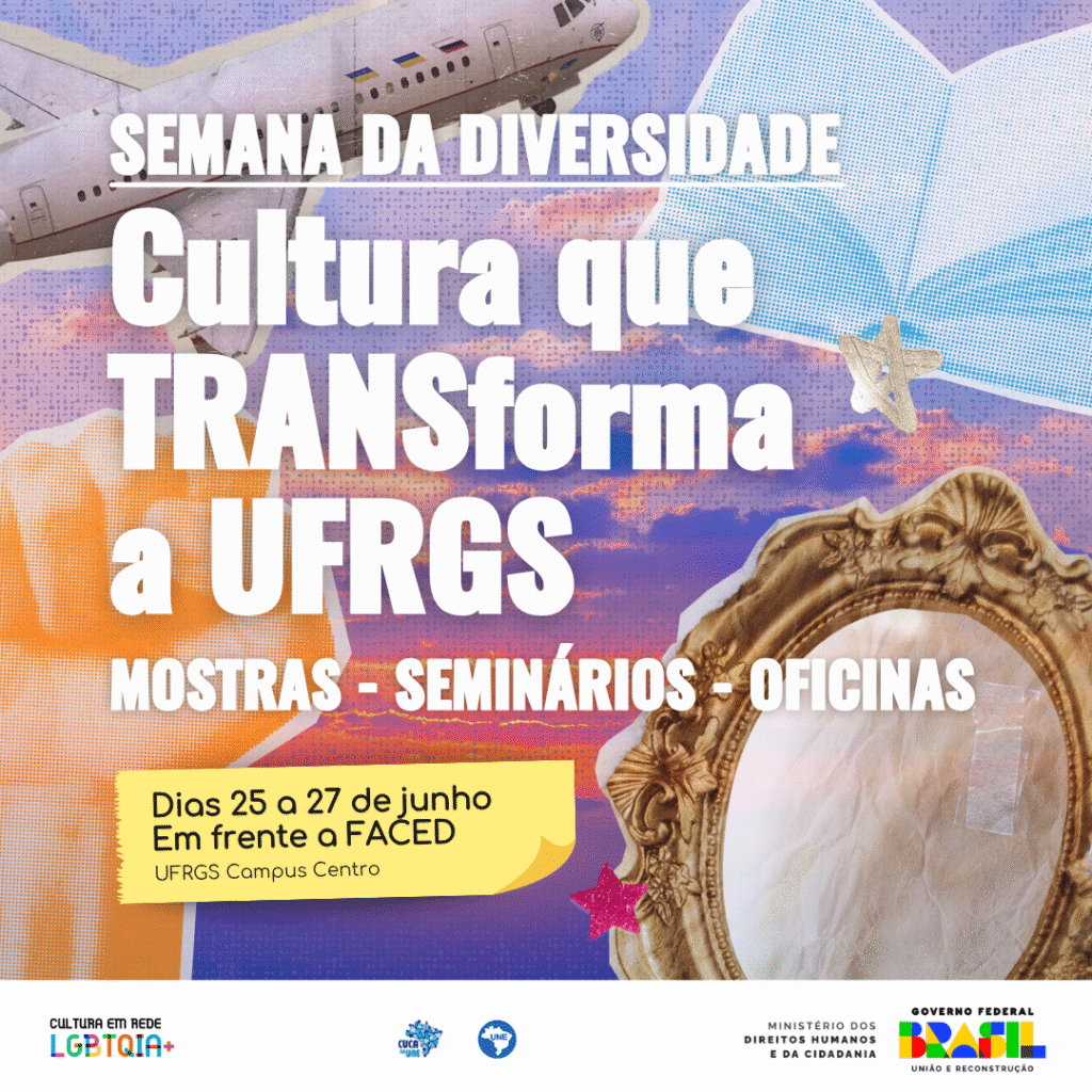 O CUCA (Circuito Universitário de Cultura e Arte) da UNE, em parceria com o Diretório Central dos Estudantes (DCE) da UFRGS, realiza entre os dias 25 e 27 de junho a Semana da Diversidade: Cultura que TRANSforma a UFRGS. O evento, que acontece em frente à Faculdade de Educação (FACED), terá mostras culturais, debates, seminários e oficinas, com o objetivo de fortalecer a luta por cotas para pessoas trans na universidade.
